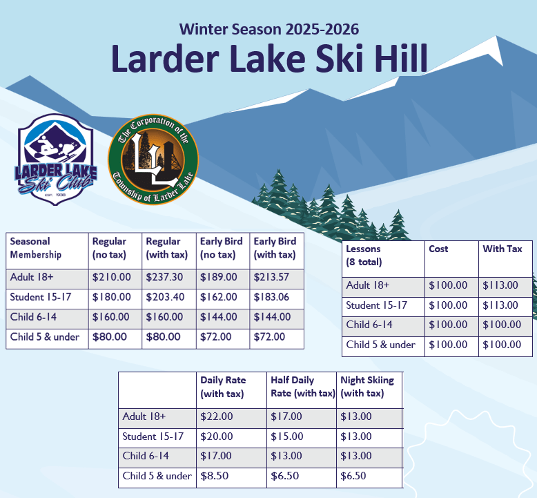 The hill is located in Larder Lake and provides a great view of the surrounding area. The T-bar tow will get you up the hill in no time, and our chalet and snack bar will keep you warm with a full stomach.